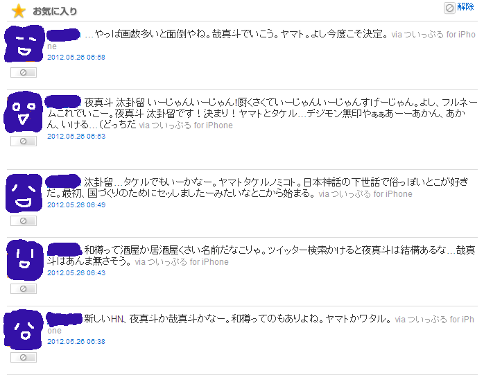 2012/06/02 Category : memo 新しい名前が決まるまでのgdgd ついたーだけですけど。ブログは変えたら変えたでご面倒ですんで、このままで。先週の朝風呂中に決まりました。哉真斗(やまと)です。サブアカのアイコン。んふんふなめこ。