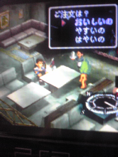 2008/07/25 Category : play a game ゼノギアス日記【20】 「暗き海の底 第三のゲート」バベルタワーにてエレメンンツに苦戦…と思って、装備品変えたらなんとか。HPフレームリカバーは「50」より「30」のほうがいいみたい…。コストパフォーマンスか。やっぱりギア戦は苦手です。うーん。さーて、サルガッソーですよきゃふふー。えめらだーえめらだー♪では、ここで小ネタを。壱.エメラダをつれて、アヴェへ行きます。弐.レストランへ行き、水槽の前にいる店員に話しかけます。参.席へつきます。するとですね…下の写メではちょっちわかりにくいですが、エメラダの服が脱げます。いよいよ敵の総本山、神聖ソラリス帝国へ乗り込みます。と、その前にエメラダの必殺技レベル上げ中。※この記事はあらかじめタイマーな予感。色々うまく行ってれば、ぽにょを見に行ってる可能性高し。