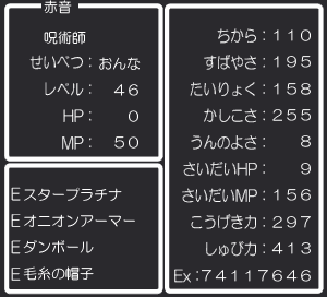 2008/07/18 Category : memo うおーー。 知人が「白川郷てG阜県?」とメールしてきたので、「ひぐらしの舞台探索?」と返しました。あーづー。今年も庭にセミの抜け殻がたくさん!明日から3連休!学生さんは夏休み!世間様はDQ5DSですが、私はまだまだゼノギアス。ぽにょの歌が頭から離れません。↓やってみた。ttp://u-enterprise.com/dqstatus/HP0なんですけど!!!すたーぷらちな…そうか「すたんど」か!!