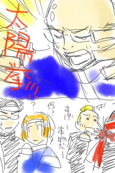 2007/06/26 Category : memo 突発性。 年に一回くらい漫画っぽいものが、描きたくなってみたり。解説しよう!(声:故・富●敬)脳内設定。・高潔&孤高合同応援合宿とか何とかで、森山さんの持ち芸。・鈴木さん、と一本木さん少年時代、原っぱで「か●はめ波」の特訓した、龍珠(意訳)無印直撃世代だと思う。・田中君お勉強一家の長男だったから、家であんまり漫画読めなくて、塾の友達から借りてコッソリ読んでたとか。・菊池くんあのくらいあたりだともう、鳴門世代なのかなー。仕事中に頭の中、ぐるんぐるんして仕方がないので、置いておきます。龍珠世代って、どのあたりまでなのかなー。 続きを読む。