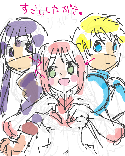 2010/02/15 Category : memo らくがきーーーー 下書きばんざいー。一応、TOVでござんす。ゲームやってない自分の認識からして、「ユーリ⇔エステル←フレン」で合ってますかねぃ?気が向いたら、後日ちゃんと仕上げるとか。気が向かなかったら、そのままの予定とか。妹がヴェスペリア買う!と宣言してから、だいぶ経つので小突いてみたりするテスト。orzフレンがどう描いても、アビスのガイ様になる…。
