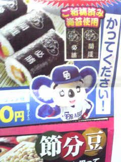 2010/02/03 Category : memo 今年の恵方は西南西ー 今年も売ります、ドアラ巻!味噌カツ、海鮮、エビフリャー、サラダ巻きの4種類1パック!エビフリャーうみゃーてかんわ。もぐもぐ…(ドアラさんが再びアジア王になりますように…中日が日本一になりますように…)