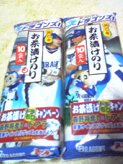 2009/07/15 Category : memo ドアラ茶漬け。 でぇたらぼっちの浜乙女さんとのコラボ商品。まぁ…袋開けると中は普通のお茶漬けで、外袋だけドアラと森野さんなんですよね…。(※ドアラ商品にはよくあること)昨夜の冷や飯に、サラサラっと掛けて、朝ご飯にしとります。
