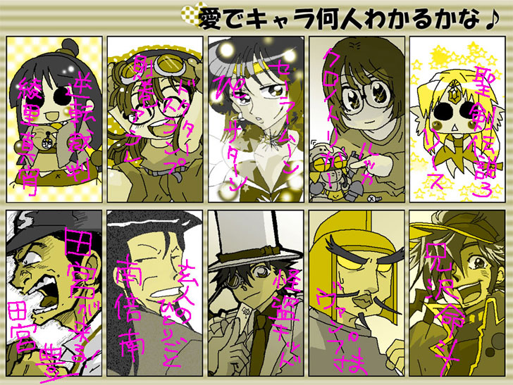 2010/05/08 Category : picture ピクシブで大流行のアレ。 ⇒8割わかったらというピクシブで大流行中のアレです。描いてみたものの…まぁ、有名どこばっかりですよね!(オッサン達を除く)続きで答えとオマケとか。ついで。携帯のテンプレ変えてみました。キラッキラッキラッ♪スタースター☆ 一枚一枚区切って描いてたので、以下並べてみたり。割とレトロ系になってもうたかも…。大変でしたが、楽しかったです!10人じゃ足りないすなー。またやってみようかしら♪ PR Comment2 Comment む トモレットさん (2010/05/10 08:40) [コメントを編集する] 6割しか分からなかったぜ! でも、友達だぜ! ま 赤音さん (2010/05/12 20:37) [コメントを編集する] だいたいどの辺りが分かったのか分かるお! …ありがたい事言ってくれるのう! Comment Form お名前name タイトルtitle メールアドレスmail address URLurl コメントcomment パスワードpassword